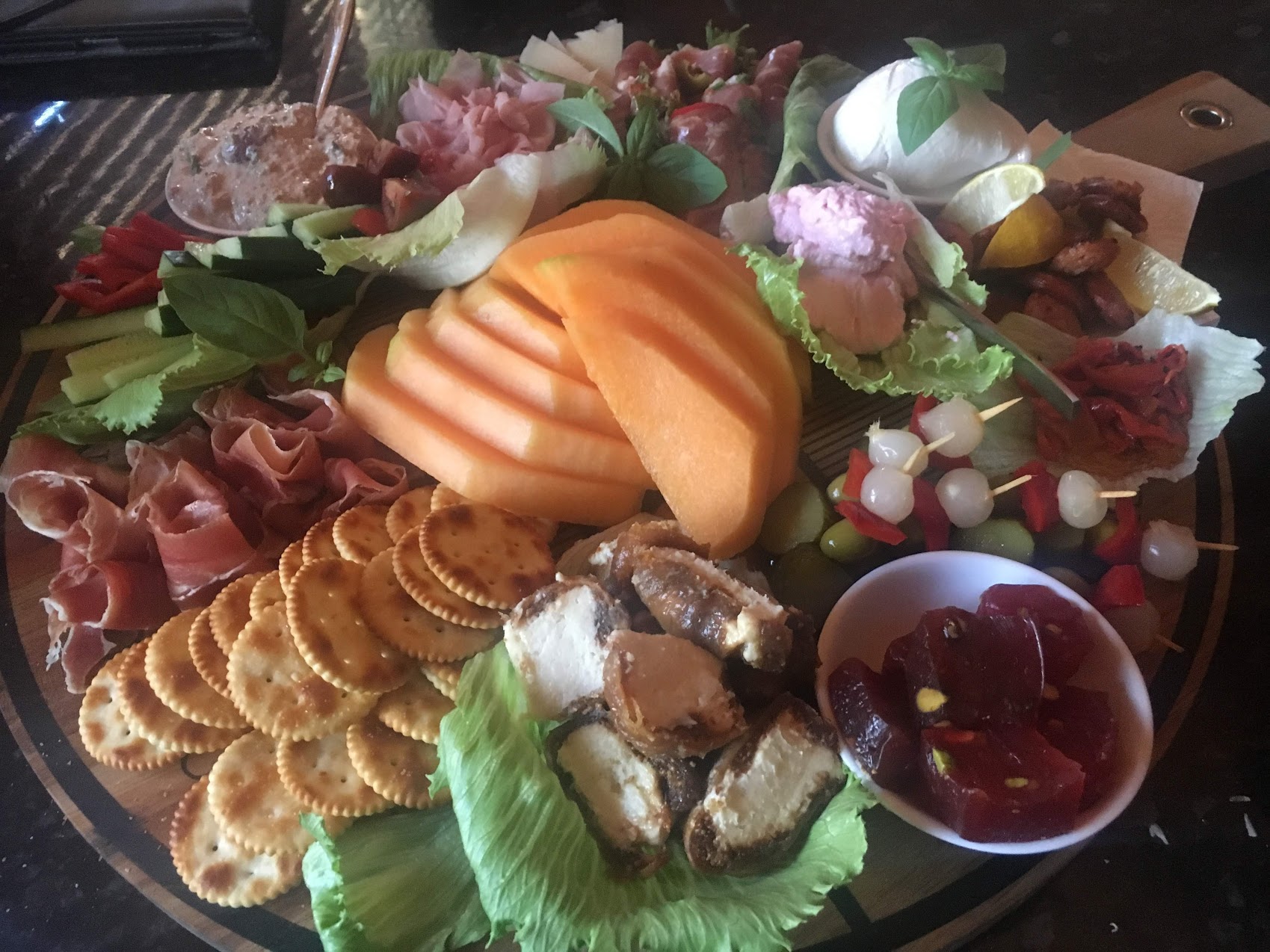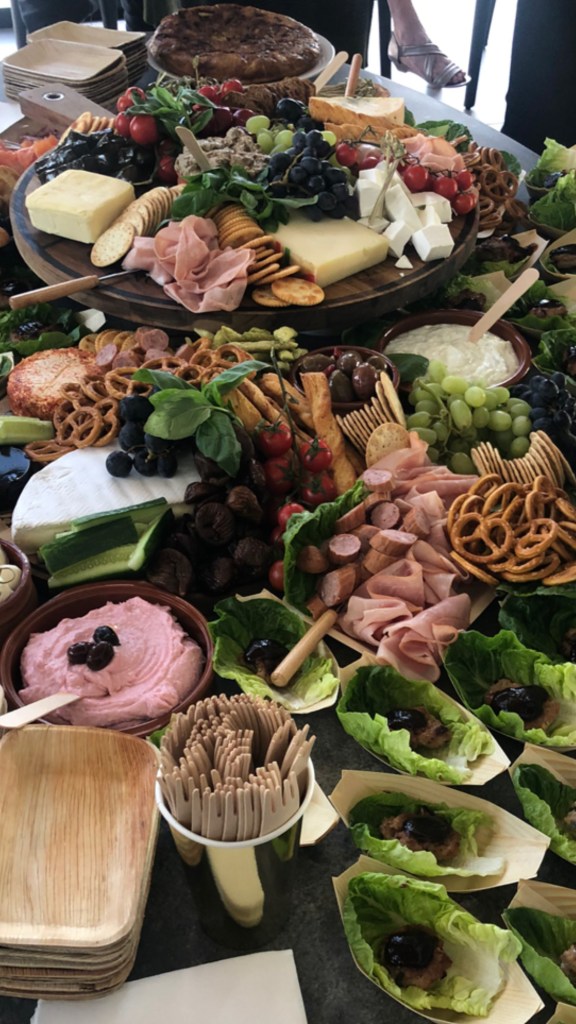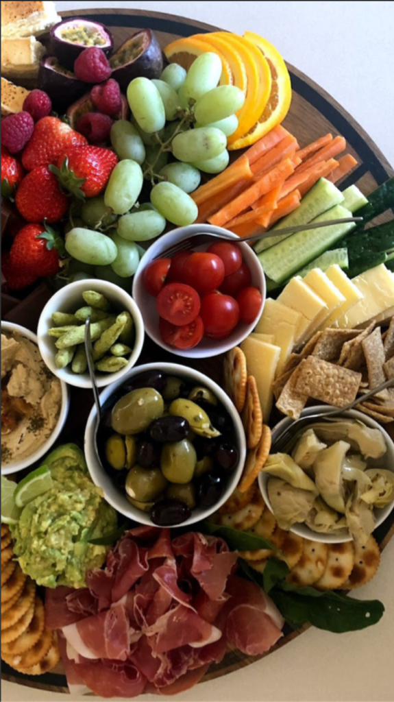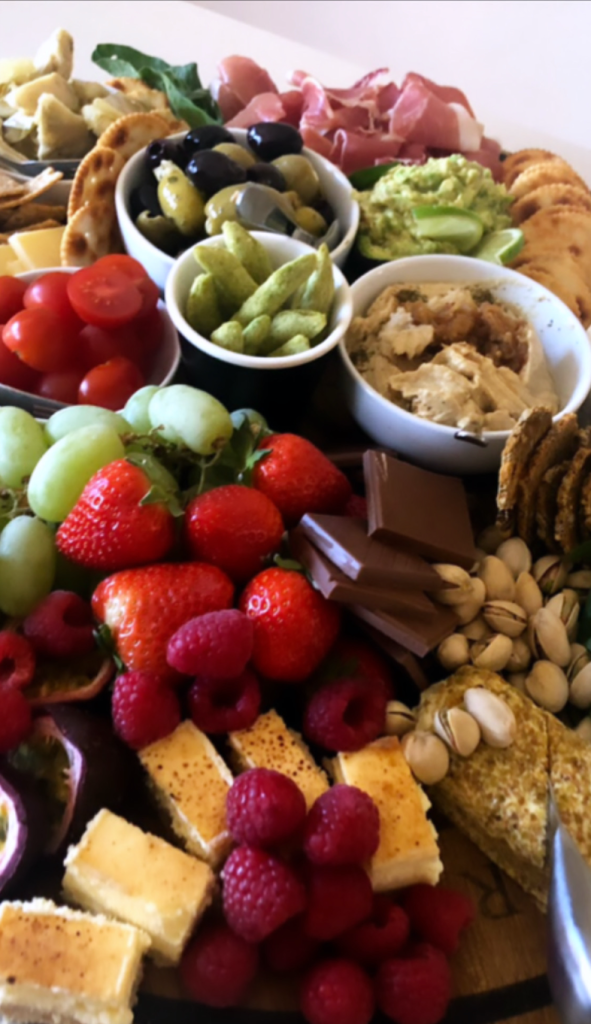 Large fresh produce [such as bunches of grapes] are placed on followed by rolled / folded proteins. Fill in sections with your carbs and finally smaller fresh produce such as cherry tomatoes. As the saying goes, we eat with our eyes! Don’t forget colour, something green or red to contrast with the cheese for example creates a visual appeal.
