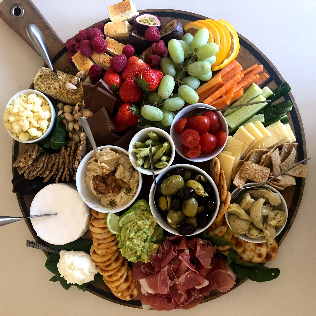 Fresh Produce; Every board needs a fresh element. This can range from grapes and strawberries to carrots and celery sticks to dried fruits – whatever is in season is best. Don’t forget your marinated olives, capsicum, artichokes etc