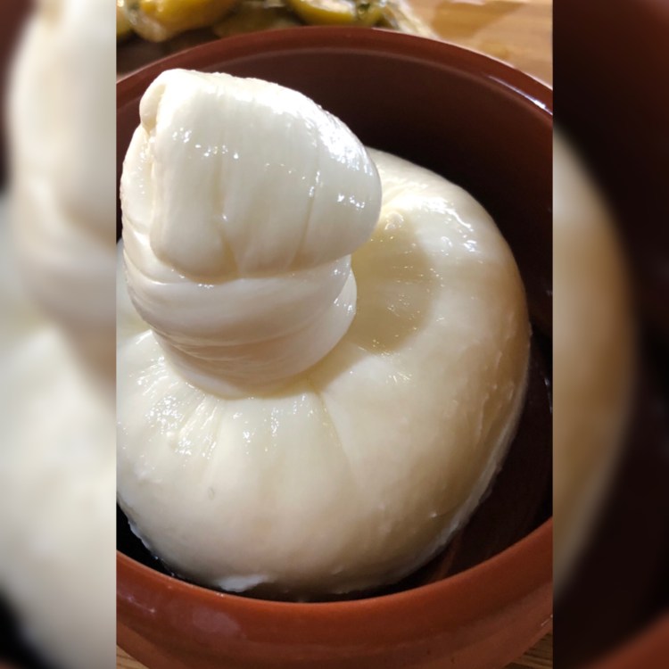 Shredded mozzarella mixed with heavy cream encased in a ball of mozzarella. Is there a more divine cheese imaginable? Pop it in a small bowl and chop up and serve with some crusty bread. Top off with some sea salt and extra virgin olive oil.