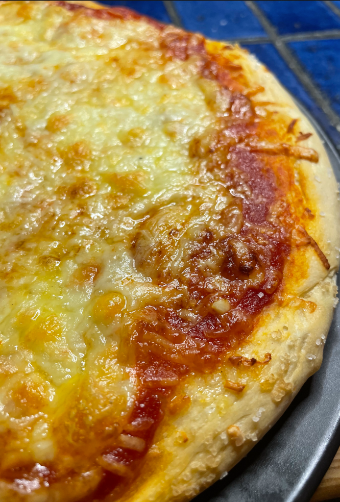 Roll out your dough, top with sauce and cheeses and handy tip, salt the crust of your pizza!!!
