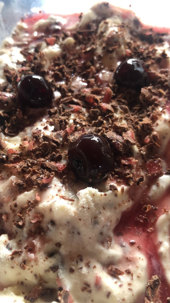 Place back into container [handy to have extra air tight containers on hand as will overfill the original ice cream contents] layering the amarena cherries throughout.