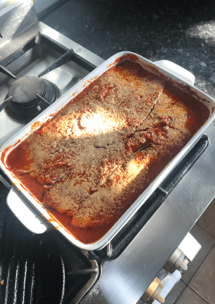 Continue this layering until the tray is full/all of the eggplant has been used and finish the top with only sauce & romano/parmesan cheese.
