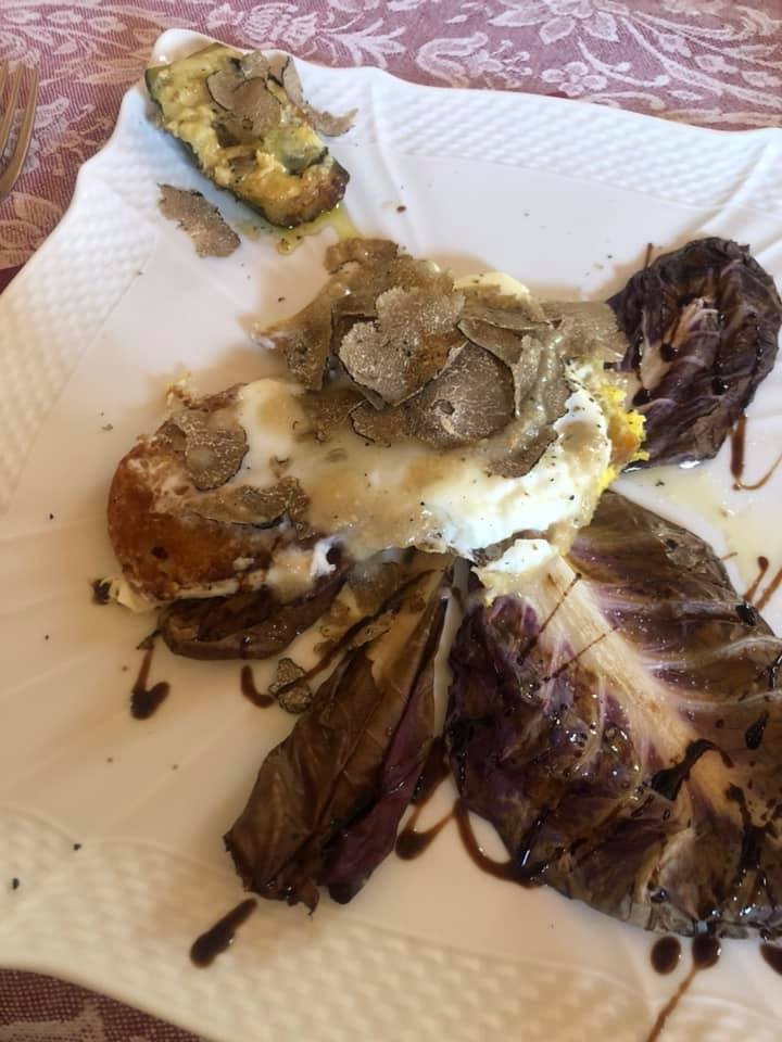 In the kitchen I could very much see myself cooking in, 2 older ladies prepared a truffle degustation. Toasts topped with extra virgin olive oil, hand sliced prosciutto, cheese and a drizzle of truffle honey. Toasts topped with white truffle paste and thinly sliced black berry truffles. Fried radicchio leaves with balsamic glaze, zucchini stuffed with cheese then roasted, then the hero, toast that was cooked in a pan with oil then when flipped an egg added to the top to fry and finished off with more fresh berry truffles.