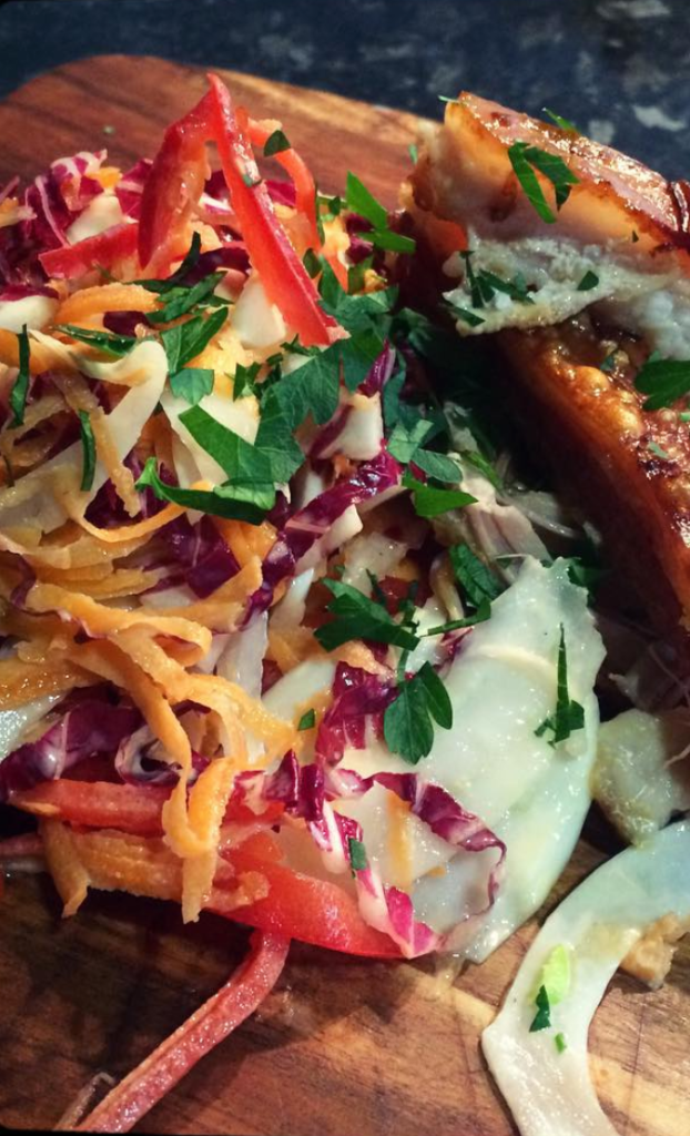Slice finely the fennel, red capsicum and radicco.