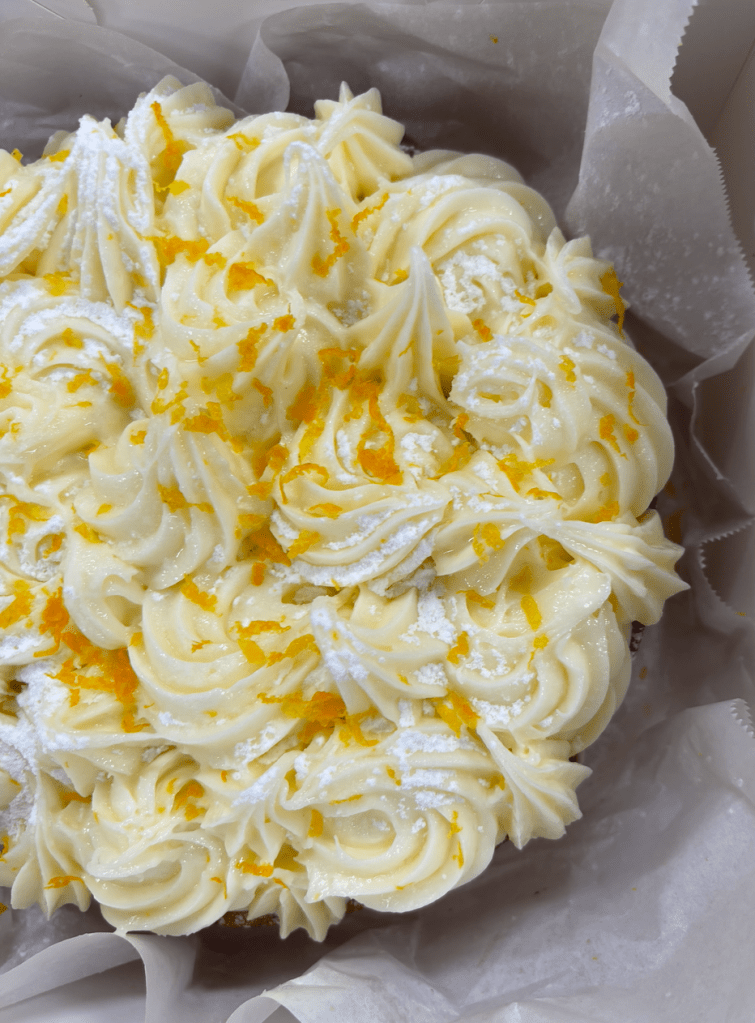 Spread or pipe onto the top of the cooled cake and grate over some additional orange rind.