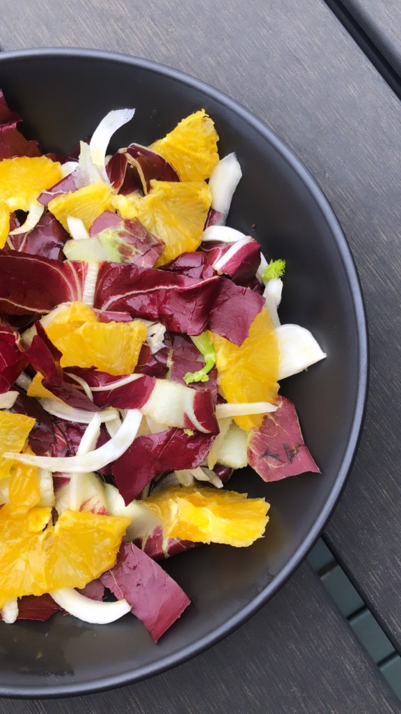 Slice up your raddichio into 1cm thick pieces [like you would a cos lettuce] and add to the fennel.