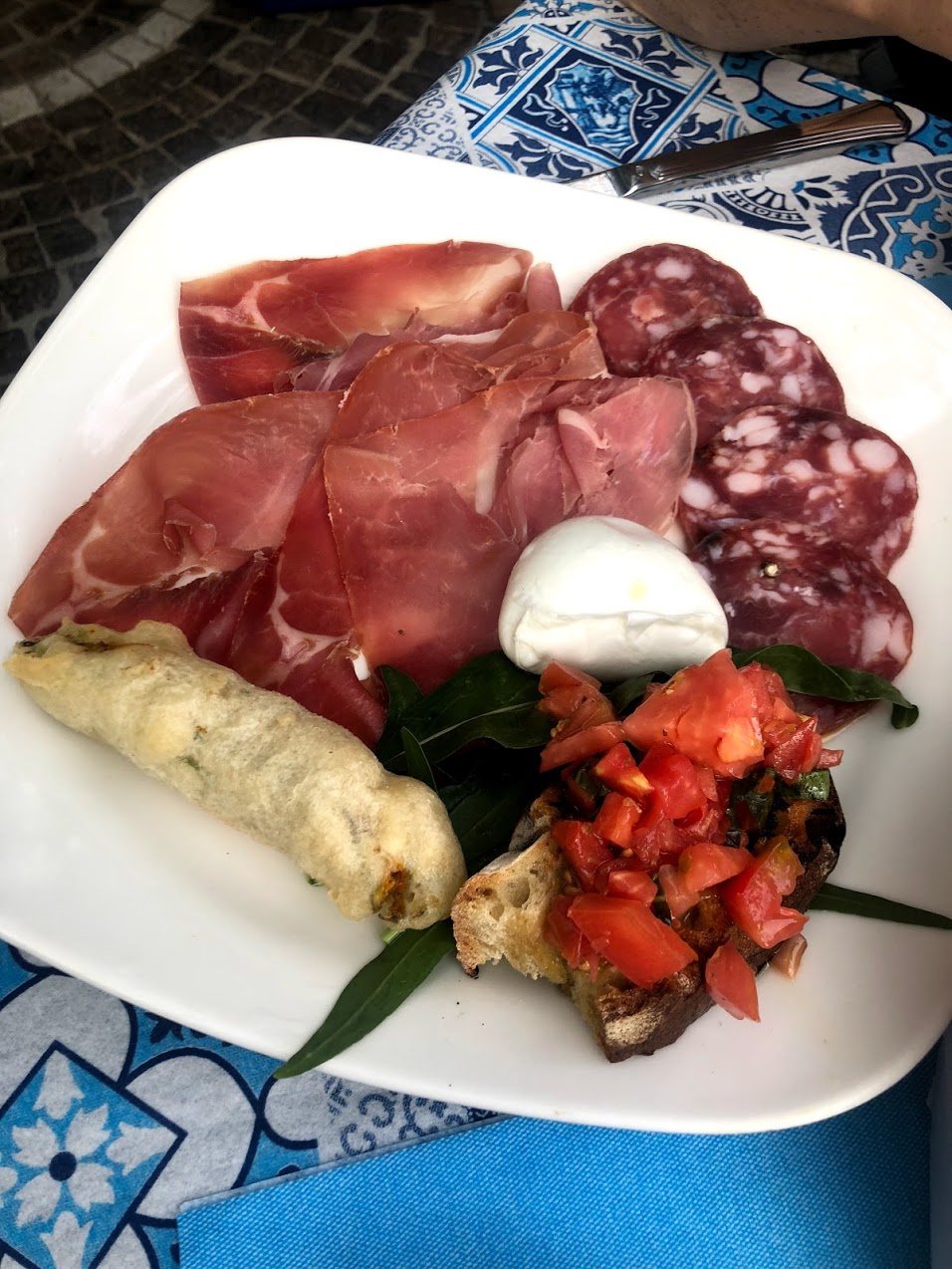 Mediterraneo: With a restaurant tip from Rach, our first food indulgence by the sea had to be at a seafood restaurant. An antipasto with bruschetta, mozzarella, salami, prosciutto and stuffed zucchini flower was quickly inhaled after an 8hr trip with no food! Main was a biacno seafood risotto; vongole, mussels, cherry tomatoes, prawns, octopus tentacles and chilli oil drizzled over the top.