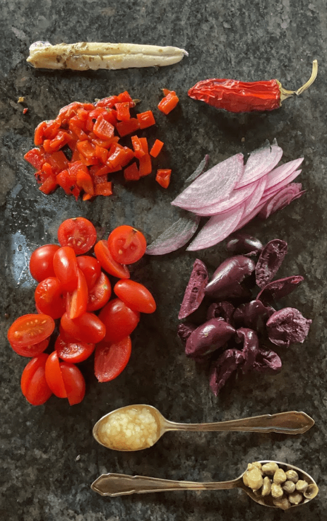 Add the olives, onion diced and tomatoes halved. Once the onions start to be come translucent add the wine to the pan and allow the sauce to cook down. Taste and season if need be but remember that the anchovies and capers will add salt to the sauce. Finish with plenty of fresh basil to serve.