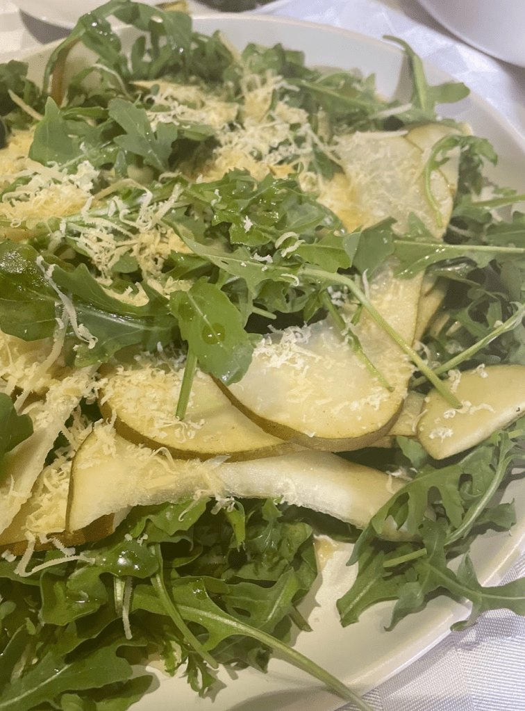 In a wide bowl or plate place half of the washed rocket and pay down half of the pear and repeat