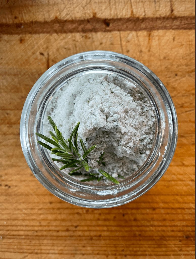 In a food processor, add rosemary removed from the steams and salt (1 part rosemary to 2 parts salt) Blitz until rosemary is fine.
