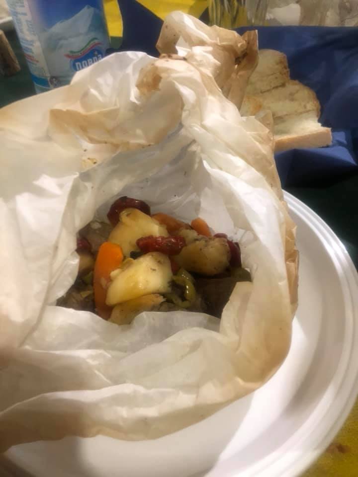 To start, a cup filled with crushed toasted bread, whipped ricotta and roasted cherry tomatoes followed by a bowl of penne ragu that tasted like the mince was the insides of Italian sausages! Next up, a parchment filled goodie bag of beef, potatoes, carrots, tomatoes and slices of green olives. Top off the night popping bottles of prosecco, fruit tarts and all of the youth singing into the late hours.
