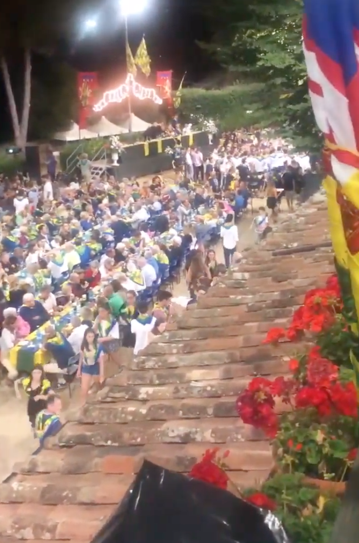 Arriving at the Bruco HQ upon sundown we were greeted with a sea of green and yellow, people singing and copious amounts of red wine being laid out on huge share tables. Just a casual 1800 people for dinner, no problems!