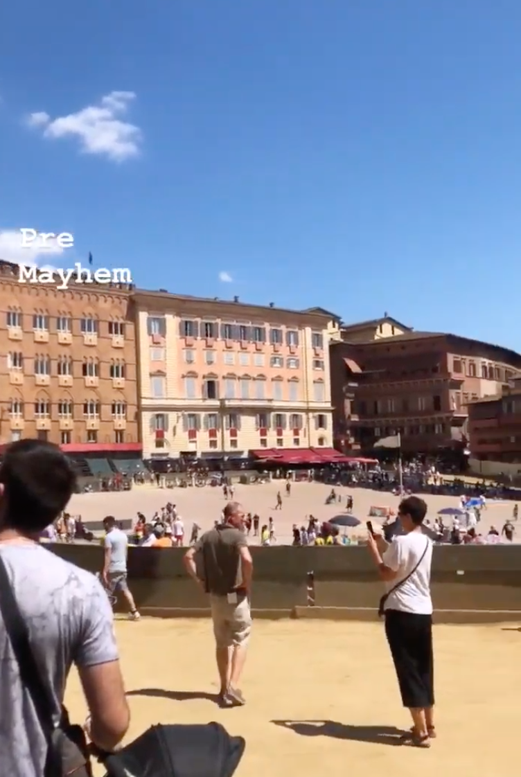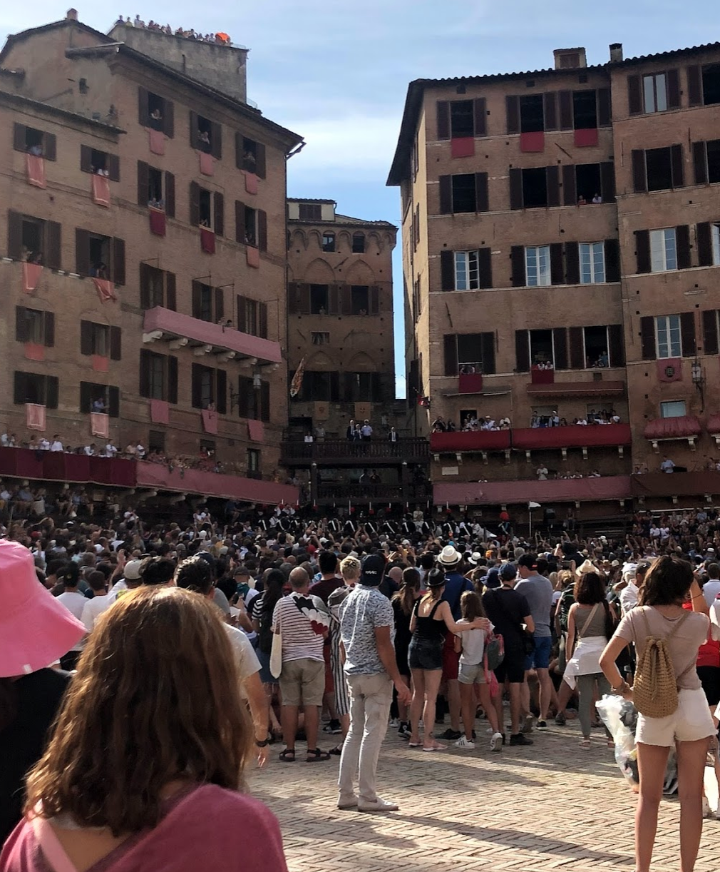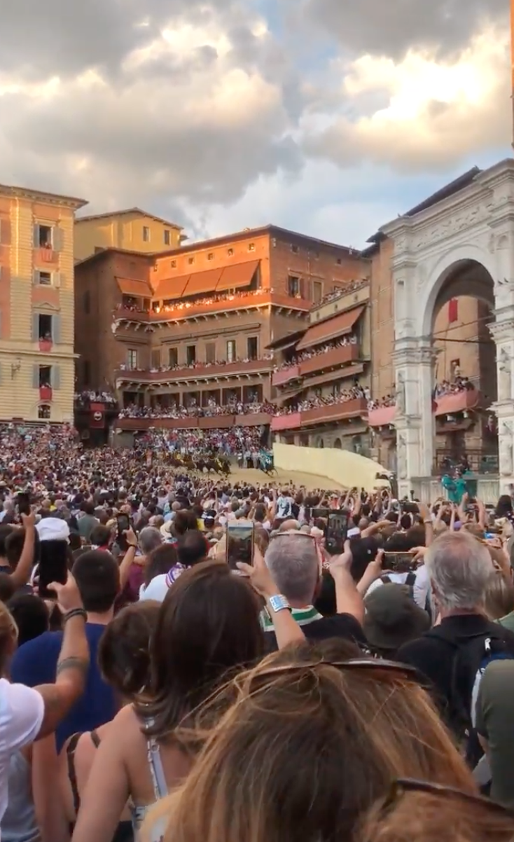 After hours tanning [sunblock in my bag somewhere near Florence] the parade concluded, grandstands filled and tension buzzing in the air from a handful of false starts the palio began! 3 crazy laps on the dirt roads saw one jockey come off his horse as others raced over him. This sneaky horse then went on to win by a hair in front of team Bruco, winner announced with the flag of the contrada hung out on display. WHAT A RUSH!