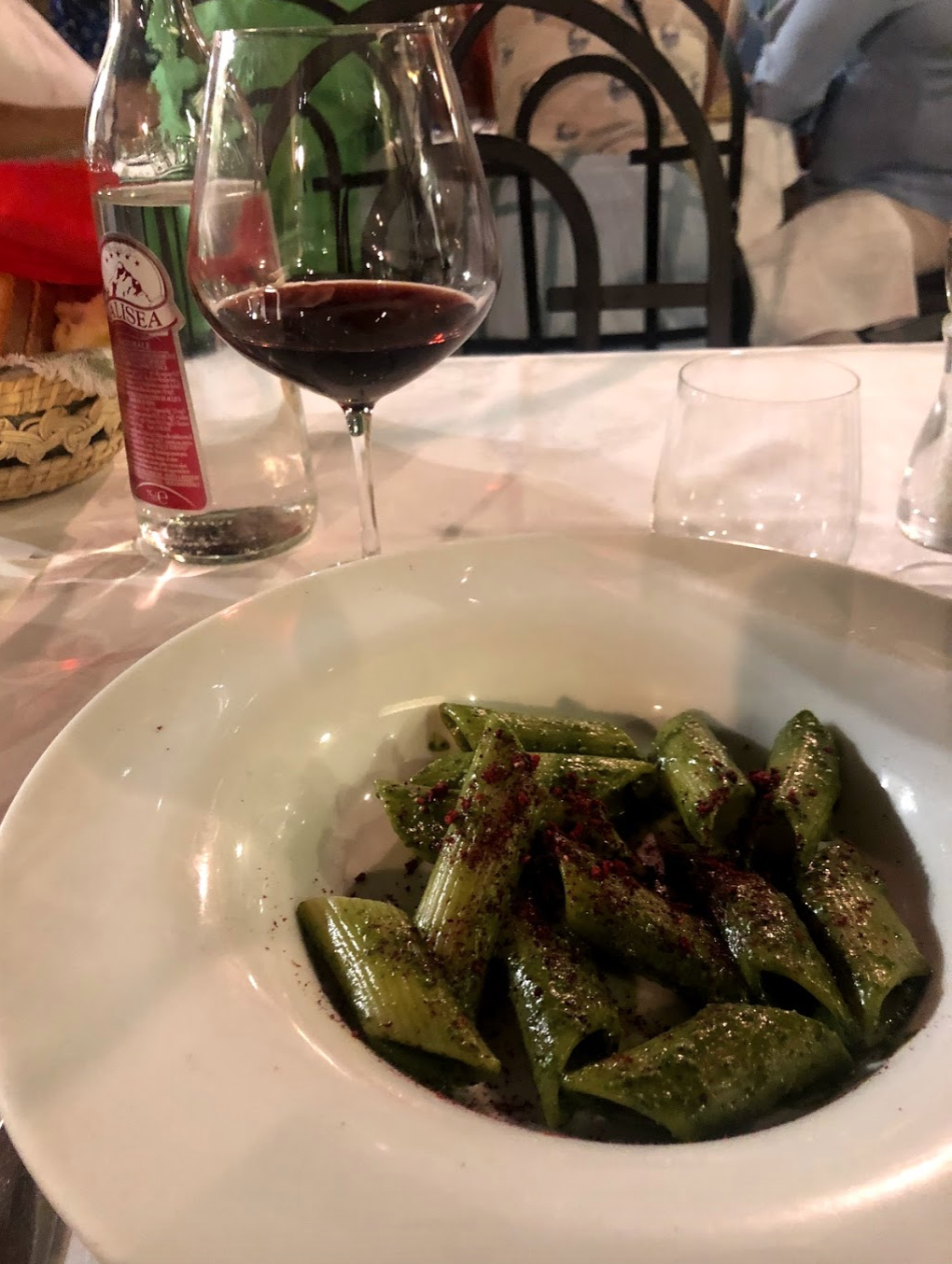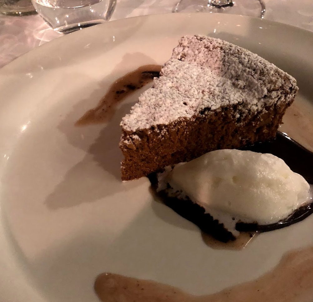Pistachio petso pennette dusted with dried raspberries. The nuts giving a crunchier texture and a fresh finish from the berry. Next up, roast beef with zucchini salad. These delicate ribbons of beef were so rich and simply dressed with some good EVO! Last up before my stroll home, torta alle noci with chocolate sauce and lemon gelato. This reminded me so much of an almond cake my Nonna always had, smiles all around.