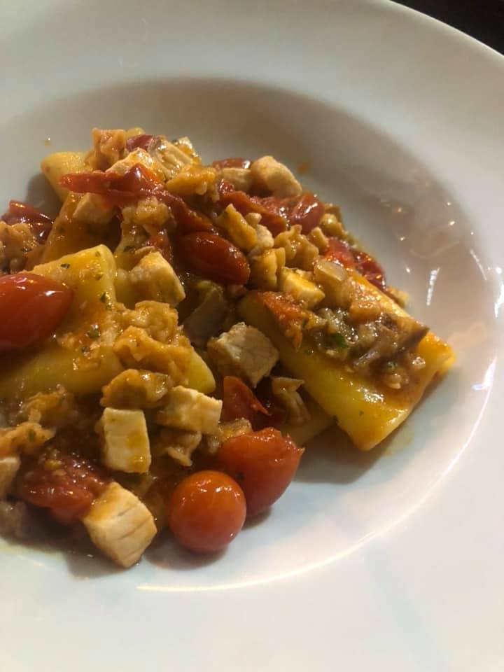 Pizzeria Porta Nova: Suggested by our B&B host. Swordfish is very popular in the south of Italy so swordfish pasta was a no brainer. The sauce consisted of lots of swordfish cubes, eggplant and while cherry tomatoes in olive oil, garlic and parsley. This was also served with a giant tube pasta called paccheri. Chauntelle had the same pasta topped with scampi in a creamy tomato sauce. Service was amazing here also!